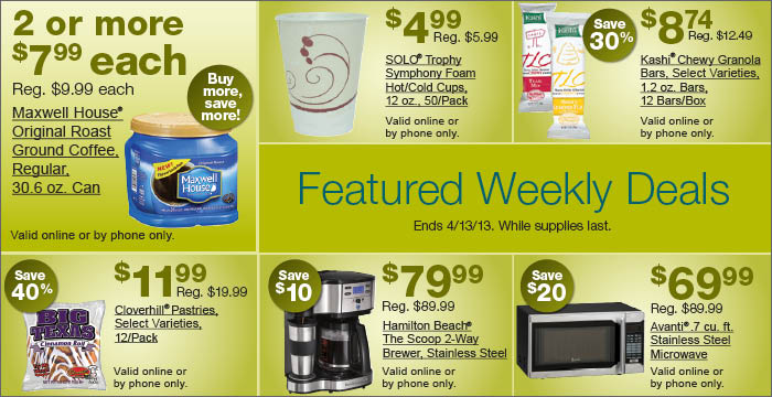 Also, stay cool with crystal clear bottled water. Enjoy holiday food gifts, a nice gift basket from Mrs. Fields, and a wide range of gift cakes and desserts, all on our classy plates and cutlery. With our kitchen appliances, beverages and even catering to aid you, your breakroom will soon be the envy of all others.