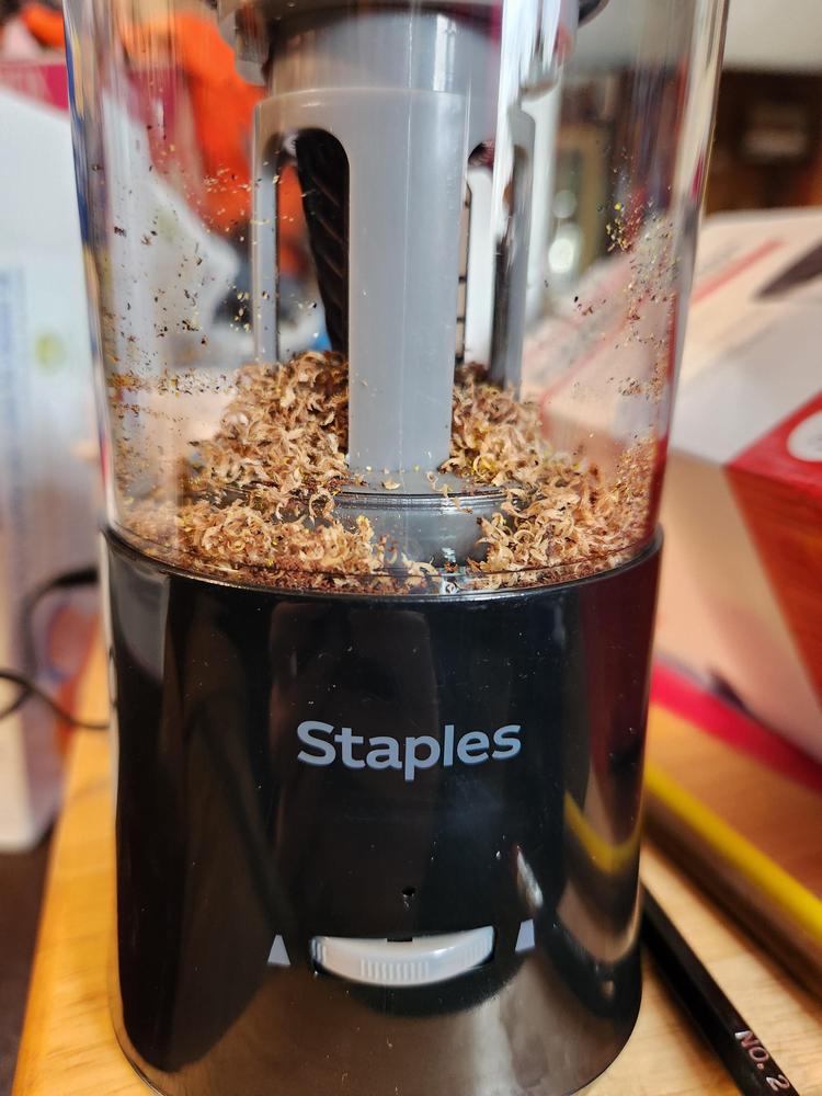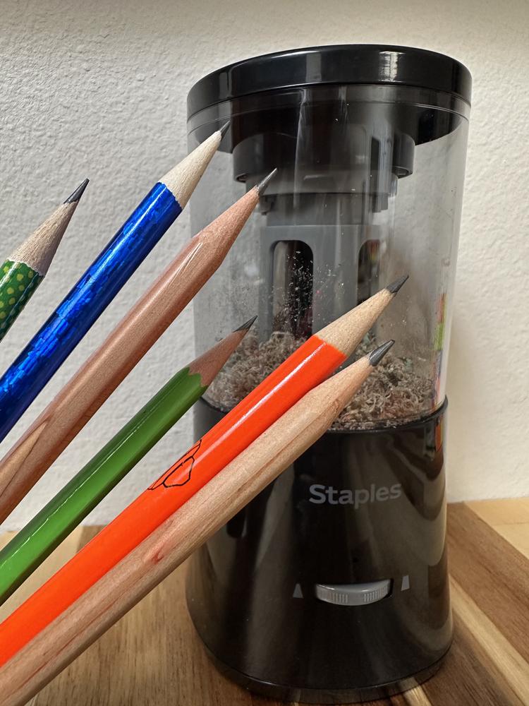 If you are in the market for a new pencil sharpener look no further. The Staples Moderate Plus Electric Pencil Sharpener is fantastic. You just have to lightly push the pencil in and the unit handles everything else. It gently depresses the pencil sharpens (quietly) and then expels the pencil upwards. The holding capacity for shavings is great as well! I have sharpene...