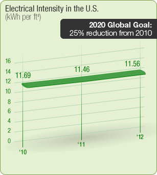 | Reduce the electrical intensity of our global operations by 25 percent by 2020 from a 2010 baseline. | Globally, our electrical intensity decreased about 3% from 2010 to 2011 (from 11.5 kWh per ft2 to 11.2 kWh per ft2). | ||
