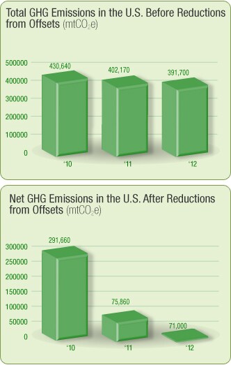 In 2011, we purchased 341 million kWh of green power in the U.S., primarily in the form of renewable energy certificates (RECs), the equivalent of more than 50 percent of our national electricity usage (in 2010, we purchased the equivalent of 25 percent). Due to the region in the country where our purchased RECs are generated, and the associated emission factors for RECs in those areas (i.e., higher emission factors because electricity production is more polluting in these regions), the resulting carbon offsets are equivalent to a significant portion of our overall carbon footprint.