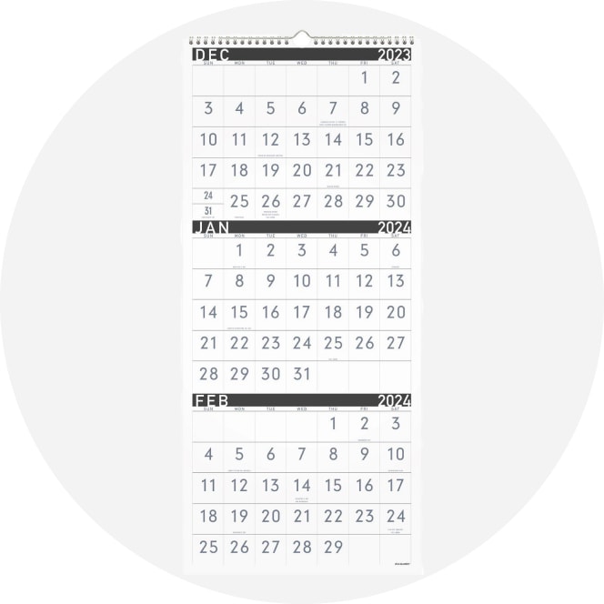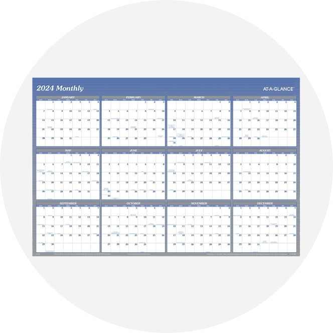 Wall calendars run the gamut – everything from decorative calendars that add color and visual interest to annual calendars that keep the big picture in focus. For the desk, check the date at a glance using a monthly calendar or track the daily details by using a day-to-day calendar. Dry erasable versions offer flexibility to keep the team on track and desk pads put a calendar at your fingertips.