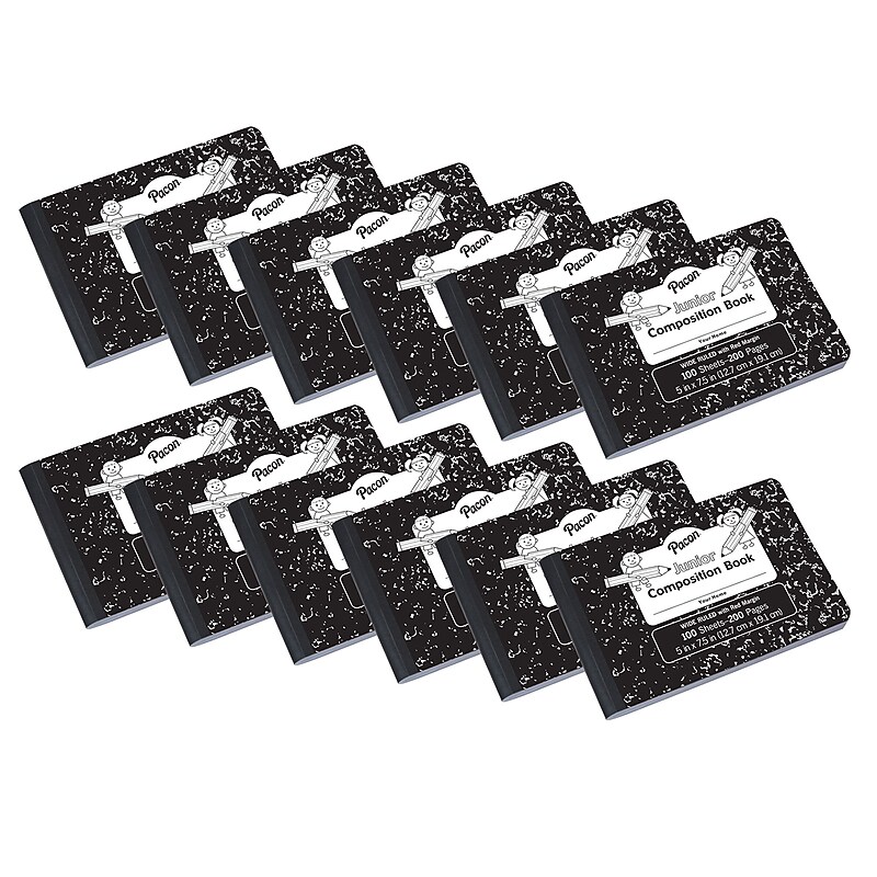 Stay prepped and ready to take notes by never leaving home without the Composition Notebook. Compact in nature, the notebook is a great tool to utilize for professional meeting notes, scholastic assignments and even personal journaling. Wide ruled format: the bright white paper is lined with margin space to allow for neat writing. Each notebook has a total of 100 pages sewn into the heavyweight covers, which provide additional protection of the content written inside. The inside of the front has a table that can be used to record weekly schedules. The inside of the back cover has reference data, including metric unit conversions, a multiplication chart and fraction/decimal information. Bright white paper has blue handwriting lines with a red margin divider. Black marble design on the front and back cover. Sold as a pack of 12 composition notebooks..Wide ruled format: the bright white paper is lined with margin space to allow for neat writing.Each notebook has a total of 100 pages sewn into the heavyweight covers, which provide additional protection of the content written inside.The inside of the front has a table that can be used to record weekly schedules.The inside of the back cover has reference data, including metric unit conversions, a multiplication chart and fraction/decimal information.Bright white paper has blue handwriting lines with a red margin divider.Black marble design on the front and back cover