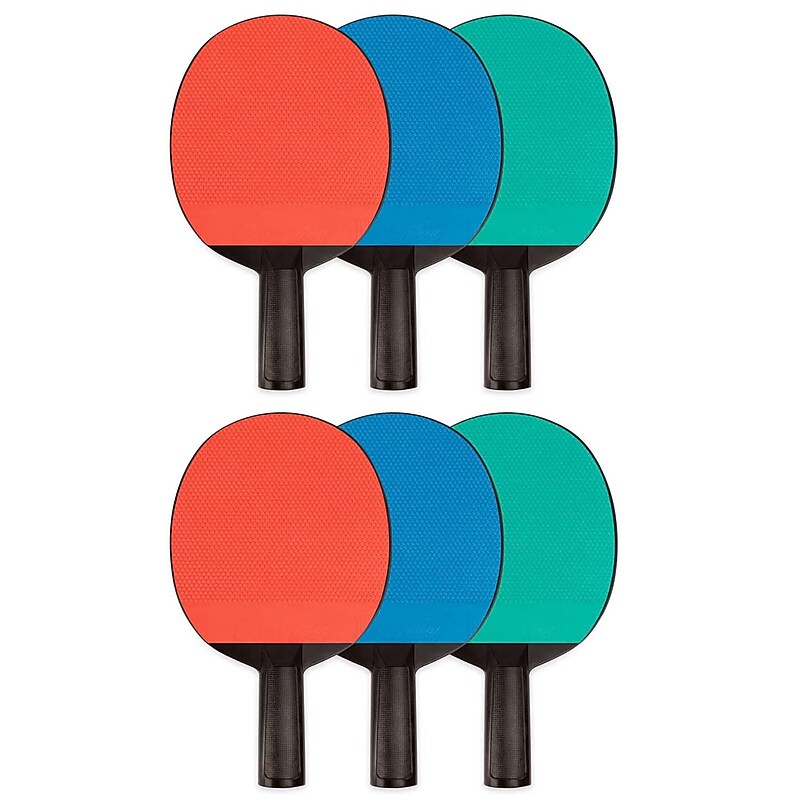 Whether you are an advanced player or a beginner, Champion Sports has the paddle for you. This rubber face paddle features a 5-ply laminated wooden handle and blade, and a straight handle for easy maneuverability. Sold as a pack of 6 paddles.• Rubber face • 5 Ply • Spin-Speed-Control Ratings: 2-7-9 • Straight handle • Laminated • 6 paddles in assorted colors (no color choice): Green, Blue and Red.Great for advanced player or a beginner.Easy maneuverability.Laminated.Assorted Colors