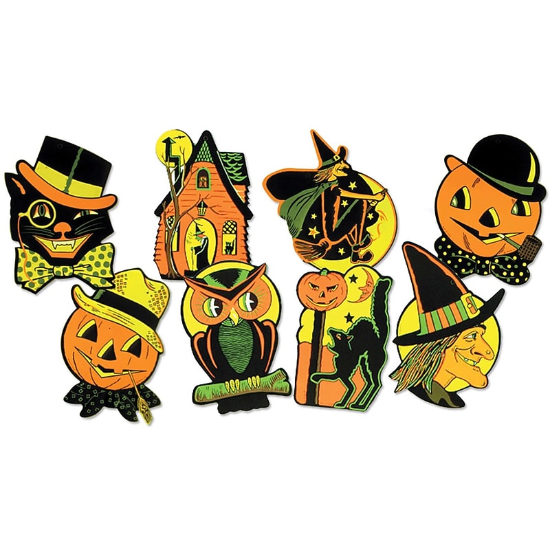 Beistle "Halloween" Cutout measuring 8 1/2" - 9 1/4" is suitable for decorating the parties, sold as 32 per pack..High quality for festive occasions.Theme: Halloween.Design: Halloweens.Includes Bat and full moon, a black cat with jack-o-lantern, a skeleton with jack-o-lantern, an old witch riding, a white ghost, a green frog, a green Frankenstein, a mummy, a vampire.Material: Cardstock.Printed on two sides.Includes 4 cutouts per pack.Beistle "Halloween" Cutout measuring 8 1/2" - 9 1/4" is ideal for putting up on a wall to decorate room for parties, sold as 32 per pack.