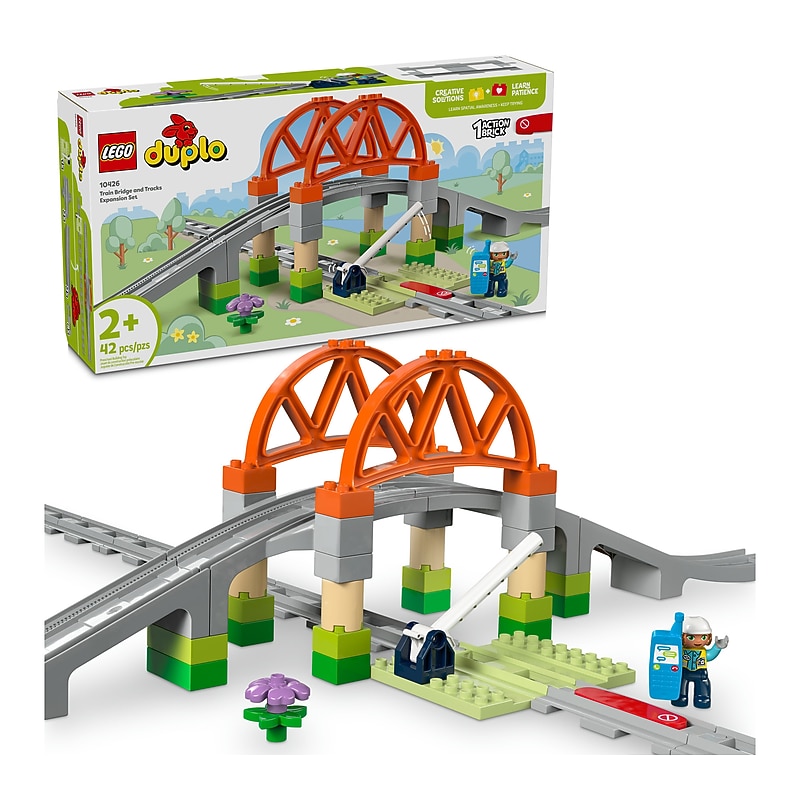 Preschool kids add even more fun to their LEGO DUPLO train sets while learning fine motor skills with this track building toy for toddlers..Train track toy set; Toddlers aged 2+ extend their LEGO DUPLO railway adventures and learn development skills with the Train Bridge and Tracks Expansion Set.Comes with lots of extra pieces to grow the fun; This creative building toy includes 8 track pieces, 1 action brick, a buildable bridge, raisable barrier and an engineer figure with a cell phone.Track building that connects to toy train sets; This set combines with LEGO DUPLO Town interactive train sets (sold separately) to expand toddlers learning journeys even further.Anytime gift idea; This extension set makes a fun treat for any toddler who loves to play with their LEGO DUPLO interactive toy train set, sold separately.Skill-building playsets; LEGO DUPLO build-and-rebuild interactive train toys are expertly designed to develop toddlers creative problem-solving, patience, focus and perseverance skills.Quality toddler toys; All elements of this LEGO DUPLO toy have been tested to the max to ensure they fulfill demanding child safety standards.Measurements; This 42-piece set includes a raised bridge measuring over 9.5 in. (24 cm) high, 41 in. (105 cm) wide and 6 in. (16 cm) deep.LEGO DUPLO train track extension set toddler toy