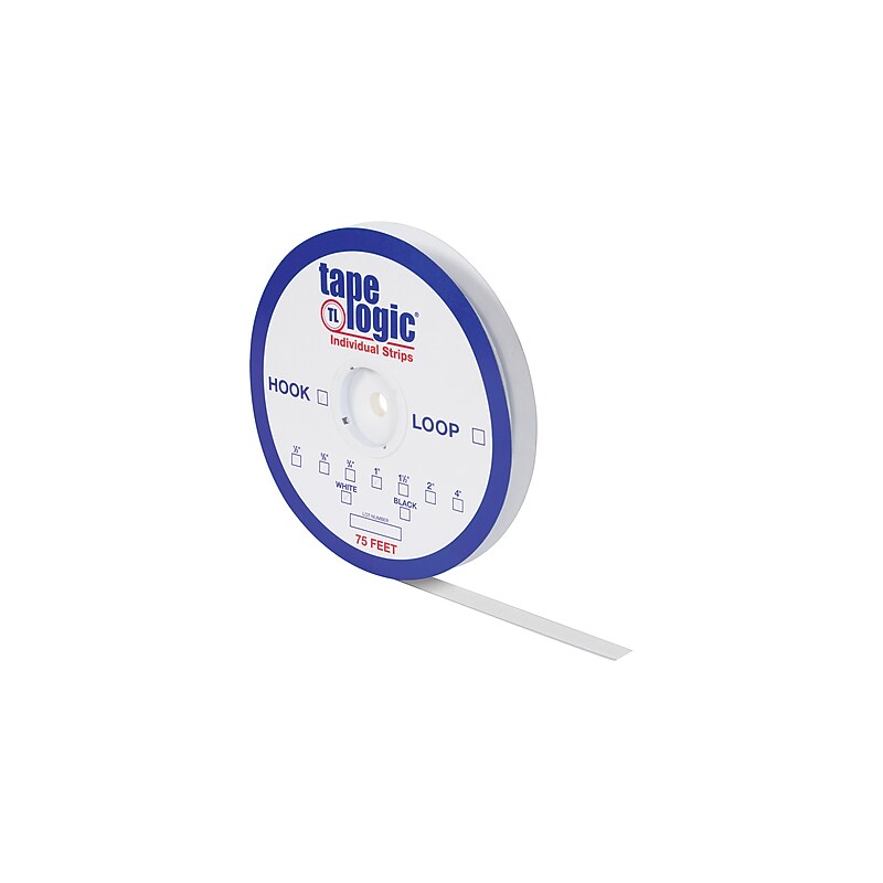 Tape Logic 3/4" x 75’ White tape loop strip is backed with rubber based pressure sensitive adhesive for applications requiring high or low temperature resistance. Tape loop is weather resistant which is suitable for both indoor/outdoor uses..Weather resistant.Tape size: 3/4"(W) x 75'(L).Material: Rubber.Freight class: 150.Touch fastner closure system - when the two sides are touched, hundreds of hooks inteRollock with hundreds of loops to create a secure bond.When pulled apart, the hook straightens out and releases from the loop.Rubber based, pressure sensitive adhesive for both high and low temperature environments.Great for hanging everything from signs, posters and displays to tools.Hook and loop sold separately.Tape Logic 3/4" x 75’ White tape loop strip makes hooks to inteRollock with loops to create a secure bonding with its touch closure system and is great for hanging signs, posters or displays to tools.