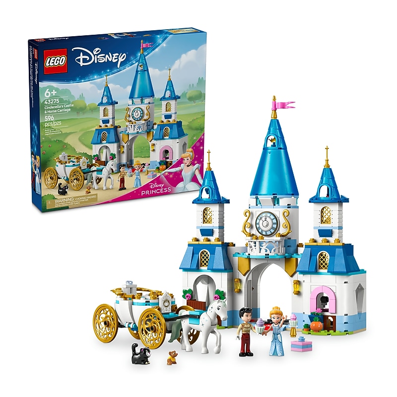 Treat Disneys Cinderella fans to a building playset with a castle, carriage, 2 LEGO Disney minidoll figures and 3 LEGO Disney animal figures..Disneys Cinderella buildable castle playset for kids; Treat girls and boys aged 6 and up with a Cinderellas Castle & Horse Carriage building playset and spark fantasy stories as kids dive into play.Model kit; Includes a buildable 2-level castle toy with a stable, multiple rooms, a spinning floor, a carriage with a harness and LEGO Disney horse figure, 4 LEGO Disney characters and more.Buildable fantasy toy functions; Place Disney Princess Cinderella and Prince Charming on the spinning floor so they can dance, or change the horses harness for a saddle or bag.Disney castle playset; The fantasy building toy has 4 entrances, including a mouse door, window for Lucifer, Cinderellas gown, crown and wand, a carriage with a harness and gold accents, and more.LEGO Disney birthday gift for kids; With a castle, carriage and 4 Disney characters, this set makes a fun gift for girls and boys who love fantasy play or any Disneys Cinderella fan aged 6 and up.A helping hand; Discover intuitive instructions in the LEGO Builder app, where builders can zoom in and rotate models in 3D, track their progress and save sets as they develop new skills.Fun skills boost; 4 Disney characters, a 2-level castle with multiple rooms and loads of details help this LEGO Disney building set boost creative play and build vital life skills through fun.Measurements; This 596-piece buildable playset includes a 2-level castle that measures over 11.5 in. (29 cm) high, 11 in. (28 cm) wide and 3.5 in. (9 cm) deep.Birthday gift with a castle and 4 LEGO Disney characters