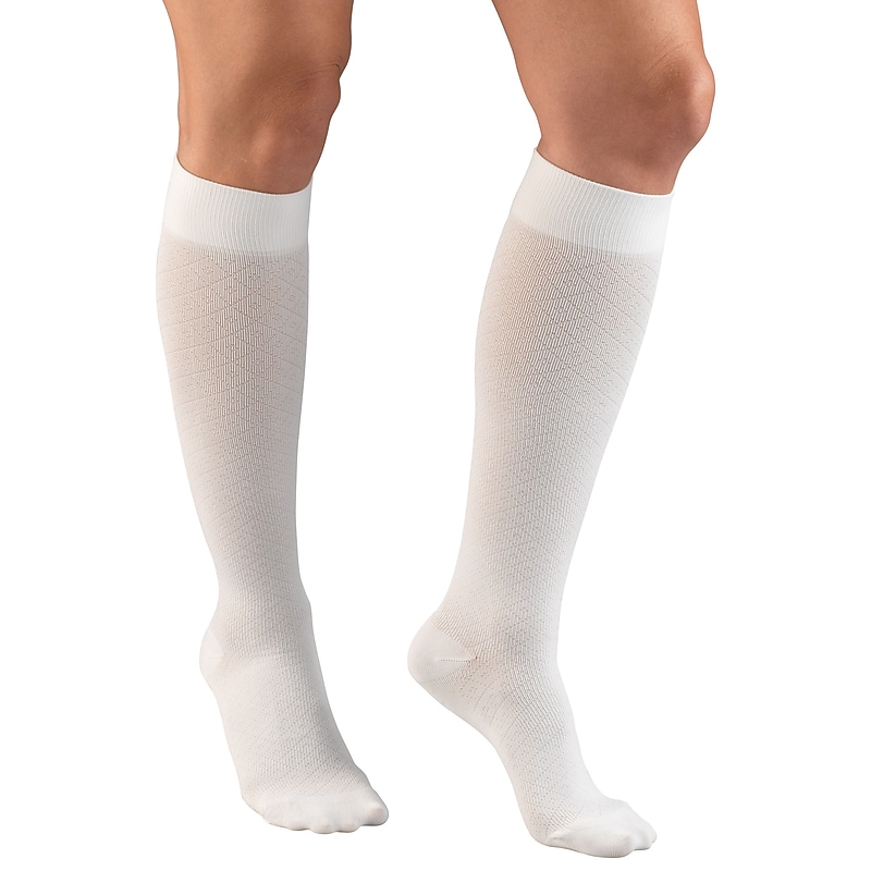 Tired legs; minor ankle, leg and foot swelling; minor varicose veins; minor varicosities during pregnancy; post surgery; helps improve circulation.TOUCH compression socks, knit with luxuriously soft therapeutic combed cotton to massage tired legs, ease swelling, and comfort your feet.Graduated Compression - Greatest at the ankle and decreasing gradually up the legs to promote healthy circulation and keep you feeling energized..Smooth Non-Slip Comfort Top - Flexible but snug, the wide stay-up top band sits comfortably and doesn't bind..Reinforced Heel Pocket - Knit-in, defined heel for added durability, comfort and proper fit..Seamless Toe Box - Hand-linked seam for greater comfort and less friction and abrasion.