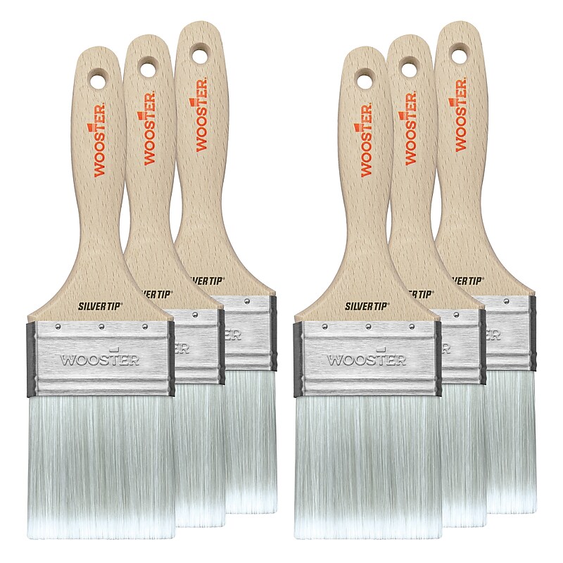 Semiprofessional quality at a great value: the Wooster Brush Silver Tip brush is made with a blend of white and silver Wooster Brush CT (Chemically Tipped) polyester that virtually eliminates brush marks. Thin, soft, and flexible ends provide exceptional leveling and smoothing. Perfect for latex paints, applying enamels on metal, or polyurethanes on wood. The birch hardwood handle adds a professional touch..Wall/trim brush working with all types of paint.Bristle is made of a soft blend of the brand's CT (Chemically Tipped) polyester filaments in white and silver colors.Brush dimensions: 11.38"H x 3"W x 1"D.Birch hardwood handle features a stainless steel round ferrule.Thin, soft, flexible ends provide exceptional leveling and smoothing.Offers a very soft yet responsive formulation, creating feather strokes.Six brushes per pack