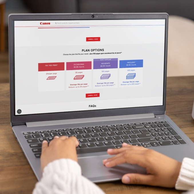 ***Upon initial enrollment you will receive a one-time introductory Promotion of 3 FREE Months of the Frequent Plan with 200 pages per month (the “Promotion”) regardless of the plan selected during initial enrollment. The Promotion may vary based on coupon code, if any, or the time of enrollment. Specific Promotion details will be provided and confirmed during the enrollment process and can be found on your monthly invoice or within your subscription account dashboard. Pages included as part of a Promotion will not rollover and any unused pages at the end of each month of the Promotion will be forfeited. For any pages printed over the 200 pages in a given month of the Promotion, there will be a charge of $ .10 per page during the Promotion period billed to the credit/debit card on file for your subscription. If payment cannot be collected during the Promotion period for such charges, then Canon will cancel your enrollment in the Promotion and the PIXMA Print Plan service. Any unused pages remaining at time of cancellation will be forfeited.