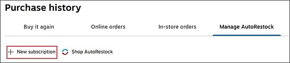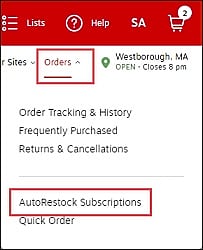 Visit AutoRestock Subscriptions by selecting the Orders menu > AutoRestock Subscriptions below the top-right navigation.