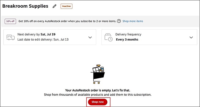 3. Once on your subscription details page, click the Shop now button to begin adding items to your subscription.