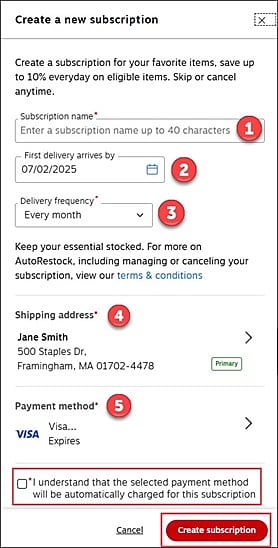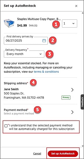 Select the checkbox confirming you understand you’ll be automatically charged based on the frequency of the subscription then select Set up AutoRestock.