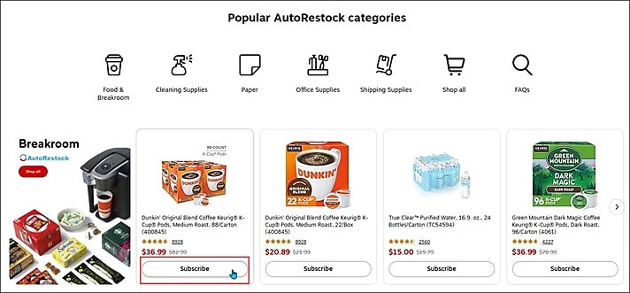 2. If you selected Shop now, the Shop AutoRestock page displays. Once you select the Subscribe button on a product here or if you did so under Popular AutoRestock categories, a drawer will extend from the right.