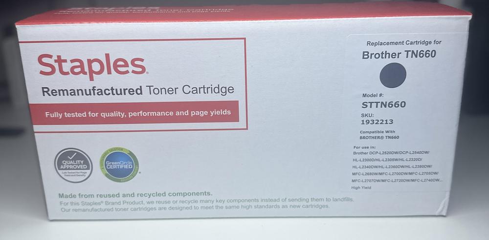 This review is for Staples Remanufactured Black High Yield Toner Cartridge Replacement for Brother TN660 (STTN6602PK), 2/Pack