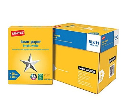 Staples® Laser paper in bright white color produces bolder black text and is ideal for high graphic color printing purposes. Paper has 28 lbs weight and is sold as 4 ream per case.